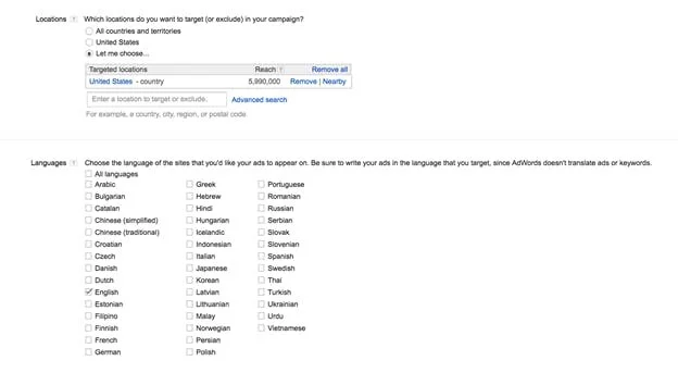 Once you’ve selected your campaign’s location, choose your target languages. It’s best to limit each campaign to one language, as this will prevent your ads from showing to people that can’t understand them (for example, English ads in a Spanish-speaking region).