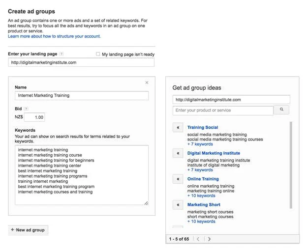 AdWords splits campaigns into ad groups - groups of similar keywords that “theme” a specific ad. In our example below, we’ve created an ad group for keywords related to internet marketing training to promote our offer:
