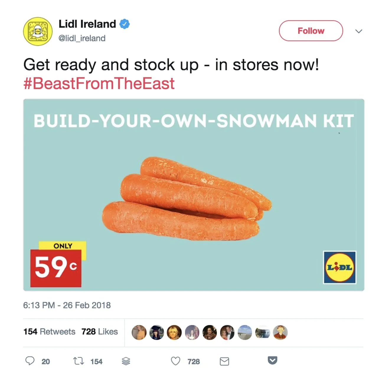 Being current means being relevant, which Lidl knows and implements regularly, like in this tweet when Ireland was stuck under snow in February: