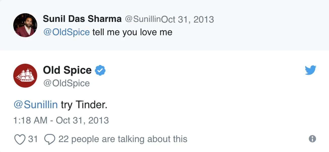 Old Spice reacts to silly tweets with, well, silly tweets, and just like everything else with their social media tone, it works: